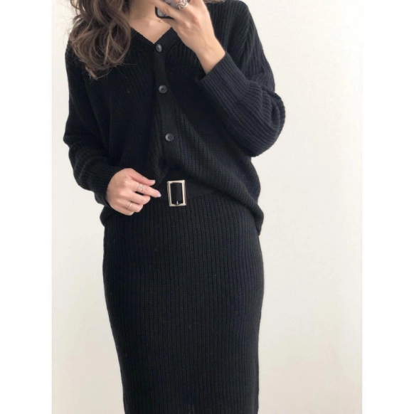 ニット×タイトスカートのロングはあたたかく、着ぶくれしないのでフレアスカートより細く見えるんですよ。ニットのセットアップで少し落ち着いた、こなれ感を楽しむのもあり。セットアップなので、トップスとボトムスを分けて使え、着回し力がさらにアップ!自分好みのセットアップを見つけたら、ぜひ手に入れたいコーデの1つですね。
