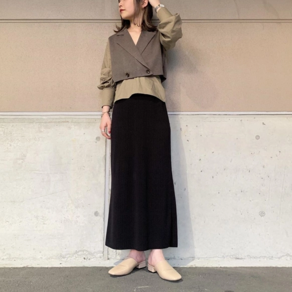 カーキのトップスがとっても秋らく、黒のリブニットスカートが良く似合っています。バランスが良く、スクエアトゥサンダルを合わせるのもすてきでおしゃれ。黒のリブニットスカートはスタイルアップ効果もあり、合わせやすいので、1着は持っておきたいアイテムの1つです。