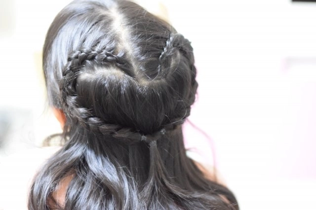 ハートの形になるように、編み込みしたヘアアレンジもおすすめです。ハート型の編み込みの方法です。1.左右の髪を、別々に少量ずつ髪をとり編み込んでいきます。2.編み込みは、半円を描くように進めていきます。3.片方の編み込みができたら、崩れないようにゴムでくくり、もう片方の編み込みを仕上げましょう。4.両方の髪が編み込みできたら、ハートの形になるようにハーフアップしてひとつにくくりましょう。5.くくったゴムの部分が見えないように、リボンなど小物をつけても良いですね。