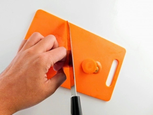 包丁を持つときは、まず利き手で包丁の柄の部分をグーで握ります。親指、人差し指、中指でしっかりと握り、残りの2本の指は軽く添える程度にしましょう。子どもの手の上に大人の手をかぶせていっしょに確認しながら持ち方を練習すると上手くいきますよ。