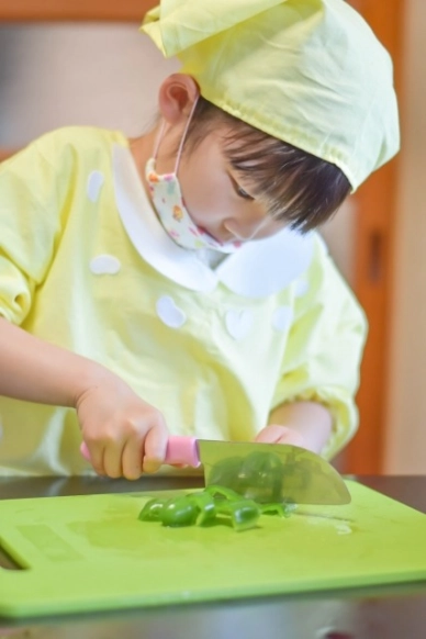 切ることを始める前に、利き手でない方の手の使い方についても教えます。食材を押さえて、包丁を安全に使うために「猫の手」の形で手を添えることが重要であることを伝えましょう。この基本の手の添え方がきちんと身についていないまま包丁に慣れてしまうと、なかなか途中で修正するのは難しいようなので、手の置き方が習慣づくまでしっかりと教えましょう。その後、押す・引くなどの基本的な切り方、慣れてきたら食材によって切り方を変えるなどより実践的に教えていきましょう。