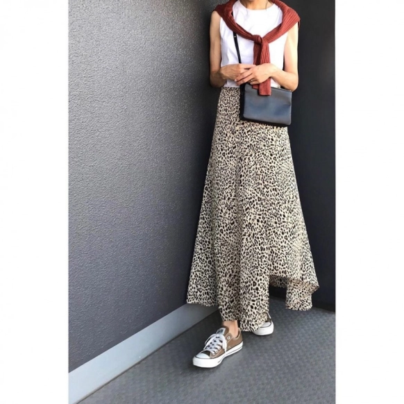 『CELINE(セリーヌ)』のレザーショルダーバッグ。レザーは使えば使うほどなじんでくるので長く使えるのも魅力です。こちらのコーデはレオパード柄のフレアスカートに同系色のスニーカーを合わせて抜け感を出しつつ、黒のレザーショルダーバッグでコーデが引き締められていますね☆