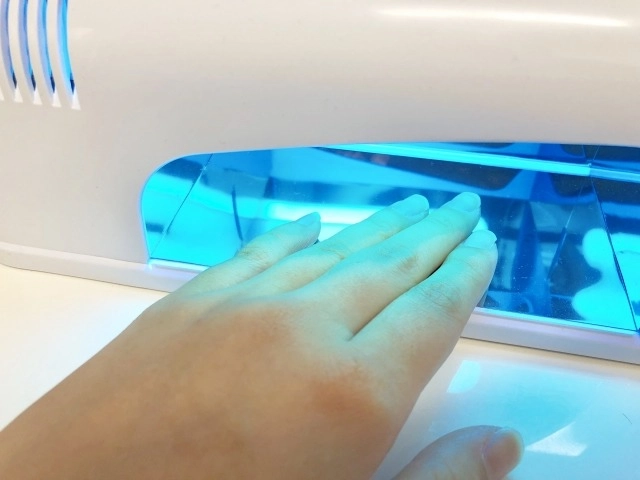 続いてジェルネイルでのやり方を見ていきます。ジェルネイル愛用者に人気の『PREGEL(プリジェル)』や『Calgel(カルジェル)』を使ってみるのもおすすめ!1.ベースカラーを塗ってライトで硬化