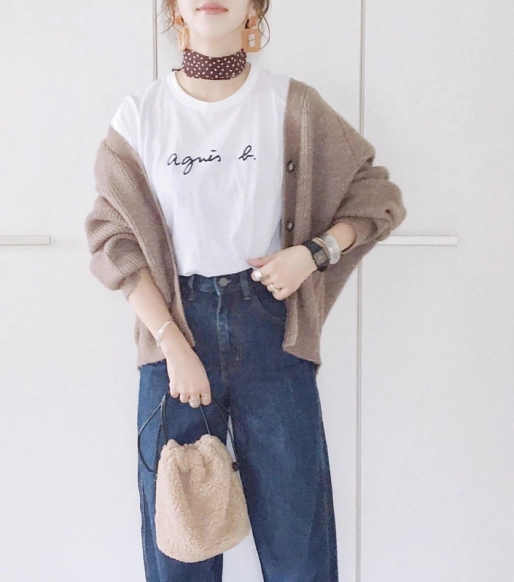 春のちょっと肌寒い日には、カーディガンをプラスして。Tシャツやタンクトップ×デニムというシンプルなコーデも、カーディガンをゆるっとはおるだけでこなれ感を出すことができますよ。首元にスカーフでワンポイントつけるのもおすすめです。