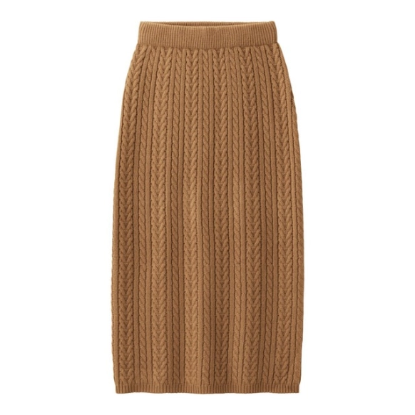 全面にケーブル編みが施された「ケーブルニットナロースカート」1,990円(税抜)は、コーデに映える立体感がおしゃれ!ウエストはゴム仕立てなので、Iラインのすっきりとしたデザインとは裏腹に、らくちんな着こなしが叶います。「ケーブルキーネックセーター」と合わせて、ワンピースのような着こなしも◎!スタイルが良く見える組み合わせが話題です。