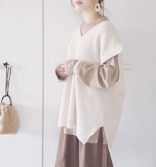 ベストも春夏に使いたいおすすめアイテム。オーバーサイズのレイヤードがイマドキバランスです。レイヤードコーデはワントーンでまとめるとすっきり見せることができますよ。暑い時期はベストのみで腕を出しての着こなしもおすすめです。