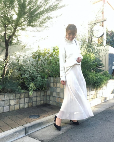 @yuko_chiba1018さんは白いニットに白いスカートのワントーンコーデ。これにアウターをプラスすれば、冬のお出かけは完璧♡ゆるっとしたニットはウエストを軽くインすると、バランス良く着こなすことができます。