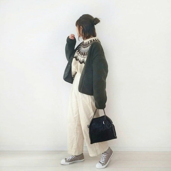 @nuttueさんは全部GUでコーディネート!ノルディック柄のセーターを主役に、オフホワイトのパンツでほっこりと。全部GUとは思えない、高見えコーデとなっています。