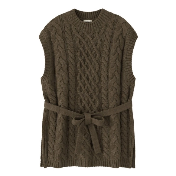 レイヤードスタイルで着こなしたいベストもGUにおまかせ!ノースリーブのベストは使いまわししやすいのが魅力です。「ケーブルニットベストQ」1,990円(税抜)は、トップスはもちろんワンピースとのレイヤードにもぴったり!サッシュベルトは取り外し可能で、着こなしの幅を広げてくれますよ。