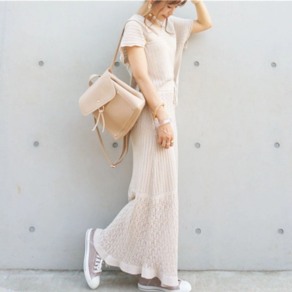 春夏のニットは涼やかなクロシェ編みが人気!優しいベージュカラーに合わせて、リュックやスニーカーも淡いカラーでまとめています。セットアップでも別々でも使えるトップスとスカート、両方ゲットしてもリーズナブルなのはGUだからこそ♡セットアップ初心者さんにも取り入れやすいのでは?