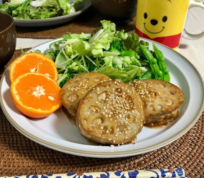 子供に人気のハンバーグを縁起物のれんこんで挟み焼きにすると、食べやすい洋風おせちに。根菜が苦手でもパクパク食べてくれそうですね。