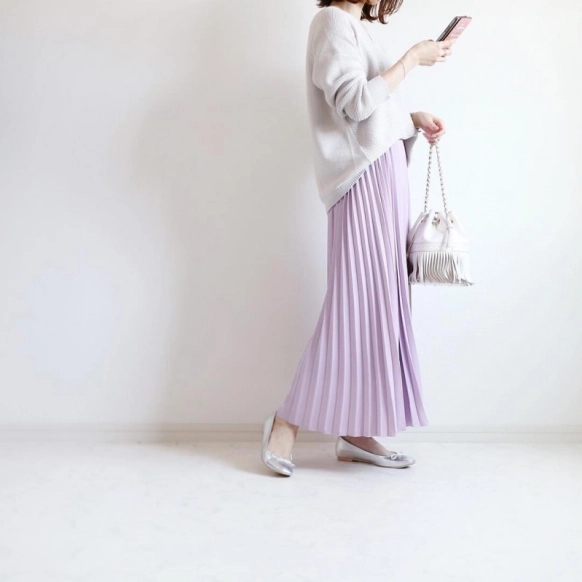 @yonnieinsさんは『CIAOPANIC TYPY(チャオパニックティピー)』のベージュゆるニットにきれいなラベンダー色のロングスカートを合わせた上品なコーデに。くすんだ色のニットと合わせることで白よりも落ち着いた雰囲気になります。春らしいカラーを取り入れてお花見やピクニックが楽しめそうなコーデです。
