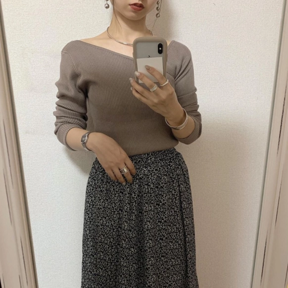 @ayamiyuunさんはfifthのオフショルのニットをチョイス。シンプルなニットはオフショルで女性らしさが出ています。花柄スカートと合わせて大人っぽいコーデになっています。