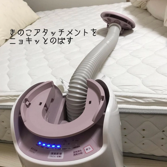 ホースの先に取りつける二股に分かれた“ふとん乾燥アタッチメント”が特徴的なこちらの機種。厚さに合わせてアタッチメントの幅を調節できるので、掛け布団と敷布団を同時に暖めたり、マットレスを挟んで一気に両面乾燥させたりと短時間で効率良く使えます。ダニやハウスダスト、花粉をキャッチするフィルターを搭載し、布団を乾燥させながらきれいな空気を保ってくれる効果も◎専用のデオドラント剤を使えば、香りを楽しめ、ダニ対策にも効果的だそう。強力な温風で衣類や靴(“靴用アタッチメント”を使用)を乾かすのにも最適です。