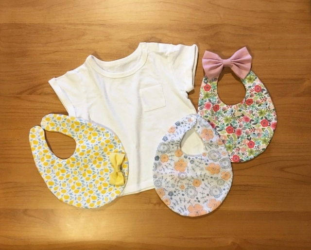 赤ちゃんがつけるとこんな感じ♡とってもかわいいですよね!その他にも、袖のついたタイプやコンパクトに畳めて持ち運べるタイプなども人気ですよ。