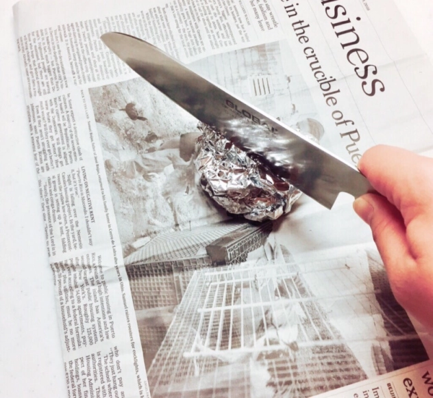 最も簡単な包丁研ぎといっても過言ではない方法をお教えします。それはアルミホイルを使う方法。なんと、丸めたアルミホイルを包丁で切るだけで良いんです。包丁にできた細かい傷に、削れたアルミホイルが入り込むことで、ガタガタだった包丁の刃が滑らかになります。砥石で研ぐより長持ちしませんが、簡単に研げるので時間がないときや砥石がないときにおすすめですよ。
