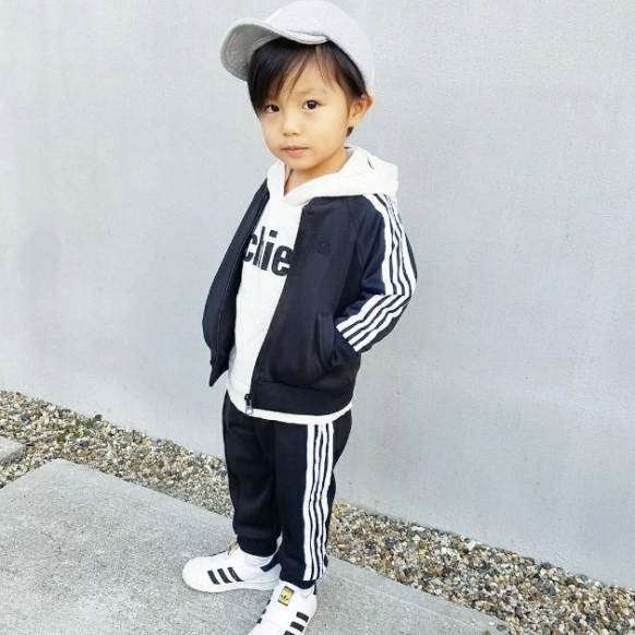 @sora_mama_gramさんのお子さんが来ているジャージはアディダスのもの。男の子ママからも女の子ママからも人気を誇るアディダスのジャージ。カラバリや柄も豊富でさまざまな着こなしができちゃいます。