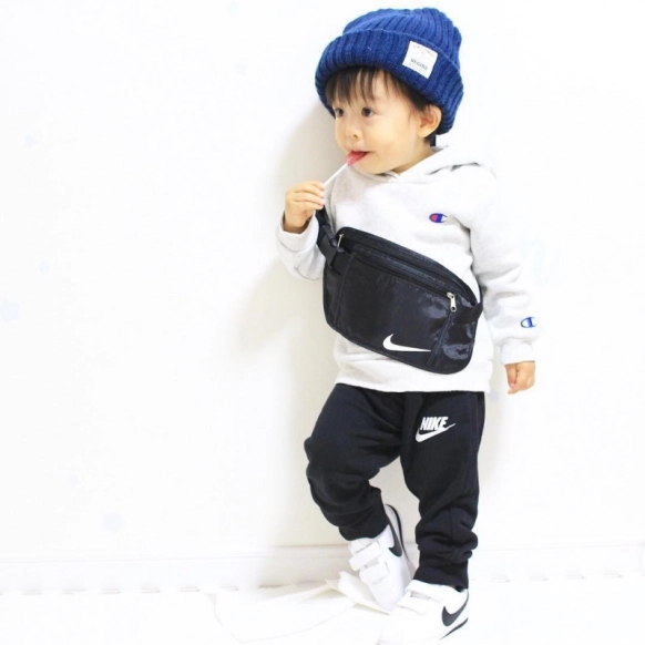 もう1枚@aran__mamaさんのお子さんのコーデを紹介します。このときは2歳2カ月だそう。ポージングも上手で目線外しショットがイケてますね♡チャンピオンのパーカーにナイキのジャージ、サコッシュ、靴でスポーツミックスコーデとなっています。モノトーンでまとめている中に鮮やかな青のニット帽がアクセントに。コーデにワンポイントとなるアクセントは外せません。