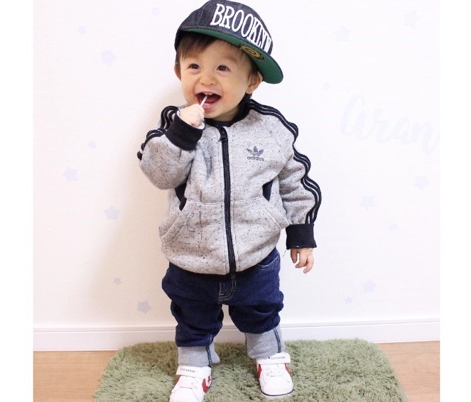 @aran__mamaさんのお子さんのジャージコーデです。このときはまだ1歳4カ月。1歳にして大人顔負けな着こなしをしています。女の子コーデのときにも紹介した不動の人気ブランド、アディダスのジャージに『LEVI'S(リーバイス)』のデニム、コンバースの靴を合わせています。
