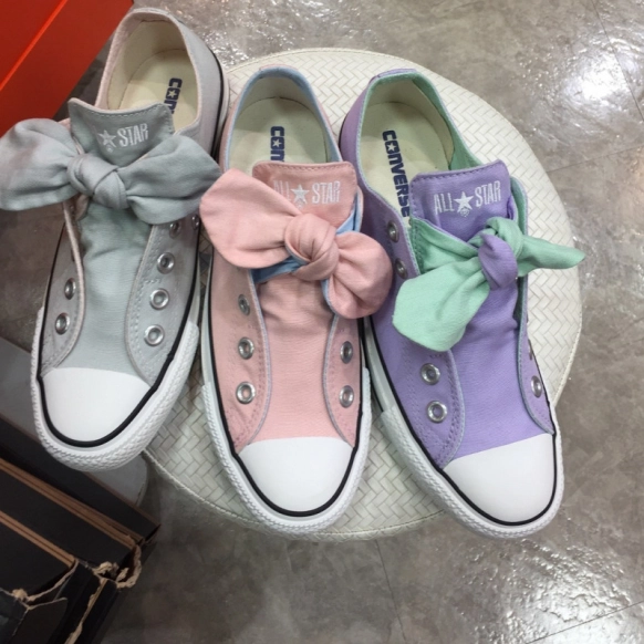 パステルカラーでかわいらしいスリッポンは、甲の部分についたリボンがアクセントになっています。カラーが違うのでリボンの裏側の色を見せてもかわいいですね。