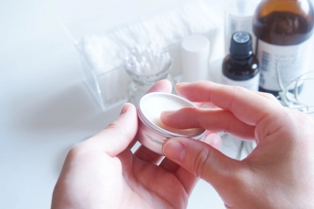 1.人差し指でクリームをすくいます。米粒ふたつ分が適量です。2.指のはらを使い、口角から横に向かって塗り込みます。3.下唇、上唇の順で塗り広げたら、口角から中央に向かって馴染ませます。4.唇全体に馴染ませたら口を閉じ、らせんを描きながら馴染ませていきます。5.最後に唇の輪郭をなぞるように塗り広げたら完成です。