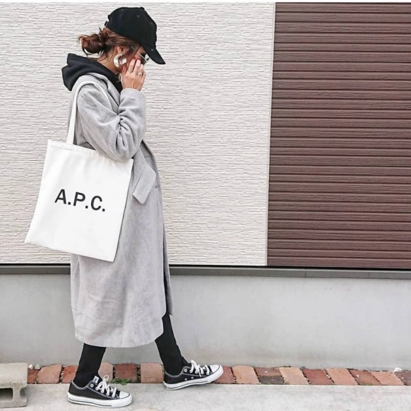 まずは、パーカー×コートのキレイめな着こなしからご紹介します。