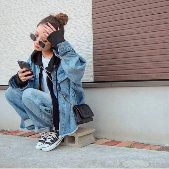 デニムジャケットとパーカーのカジュアルアイテム合わせなら、カジュアル見せはバッチリ!@amoria______さんはボトムもデニムにした上級者コーデに。チェーンのミニバッグで上品さもプラスしています。