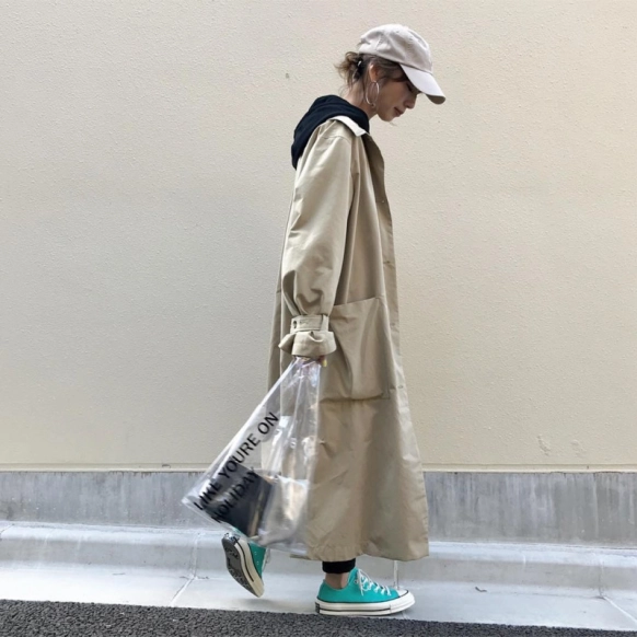 ロングトレンチコート×パーカーの足元は、鮮やかなグリーンのチャックテイラー!ベーシックカラーのコーデだからこそ足元が際立ちます。カジュアルなのに女らしさを感じるのは、まとめ髪と大きめピアスのおかげ!おしゃれバランスは抜群です♡
