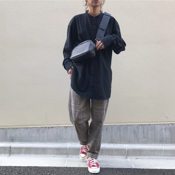 スタンドシャツとチェック柄のワイドパンツというメンズライクなコーデの足元は、赤のチャックテイラーをちらり。あえての華やかカラーで、コーデに女度をプラスしています。