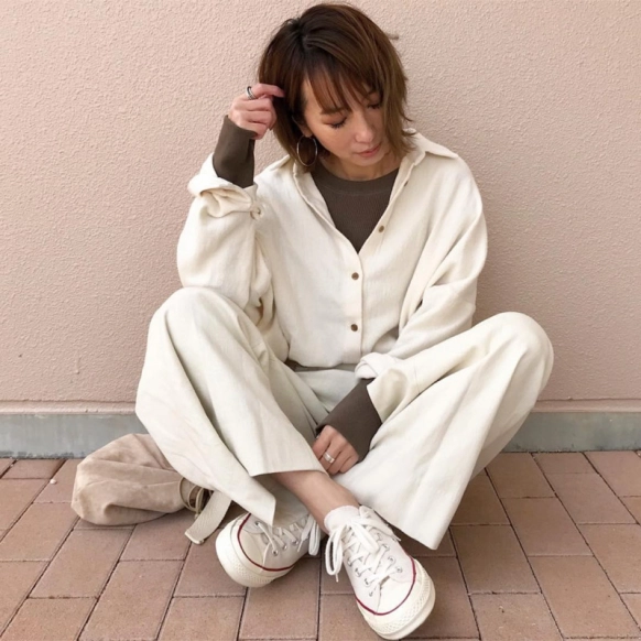 @kumika_iiio2さんは白のワントーンコーデに、おなじく白のチャックテイラーを。かっちりコーデをうまくカジュアルダウンしてくれています。