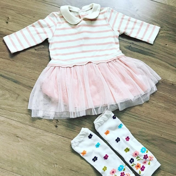 春におすすめなのが、チュールスカートつきのロンパースとレッグウォーマーのコーデです!春らしいふんわりとしたチュールスカートが赤ちゃんの魅力をアップさせてくれます。この姿でハイハイやヨチヨチ歩きを始めたら、もう写真連写が止まらないでしょう。