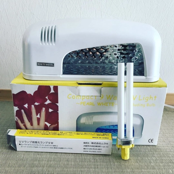 UVライト9Wは、ライトが1本しか入っていないので、小型で低価格なのがうれしいところです。硬化の速度も5~8分程度と、太陽光に比べて格段に速いため、短時間で作品が完成します。