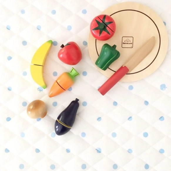 セットの内容はお値段によって、シンプルなものから盛りだくさんなものまでさまざま。でも初めてのおままごとセットなら、果物や野菜、ケーキなどの食べ物プラス包丁とまな板で十分でしょう。
