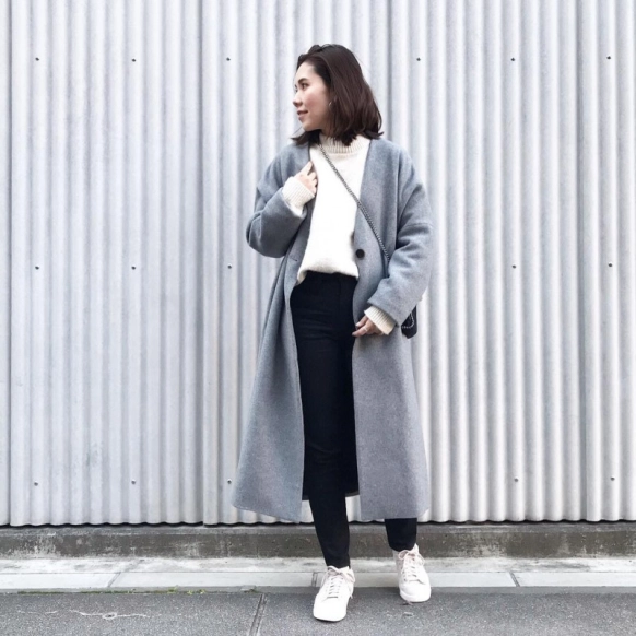 冬のモノトーンスタイルにも、ナイキの白スニーカーが活躍します。ハイネックニットを使ったスタイリングに合わせれば、大人カジュアルな印象のコーディネートに。エレガントなノーカラーコートを羽織れば、女性らしさのあるモノトーンスタイルに仕上がります。
