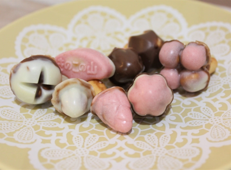 傘やしいたけ、四つ子など8種類の形が作れる型に、チョコレート、ホワイトクリーム、ピンククリームの3種類のチョコクリームを好きなように入れて、最後にクラッカーをまっすぐさして冷蔵庫で固めたらできあがり!オリジナルのきのこの山が作れちゃいますよ。