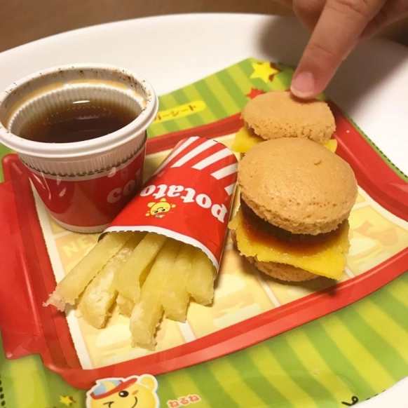 見た目も味も本物そっくりのハンバーガーセットを作ることが可能。ナイフを使ってパンやハンバーグ、ポテトを切って調理をしている気分に。パンのもと、ハンバーグのもと、チーズのもと、ケチャップのもとを使ってミニハンバーガーを2個作れます。シートで旗やポテトケース、ジュースカップなどを作ってハンバーガー屋さん気分を味わって。