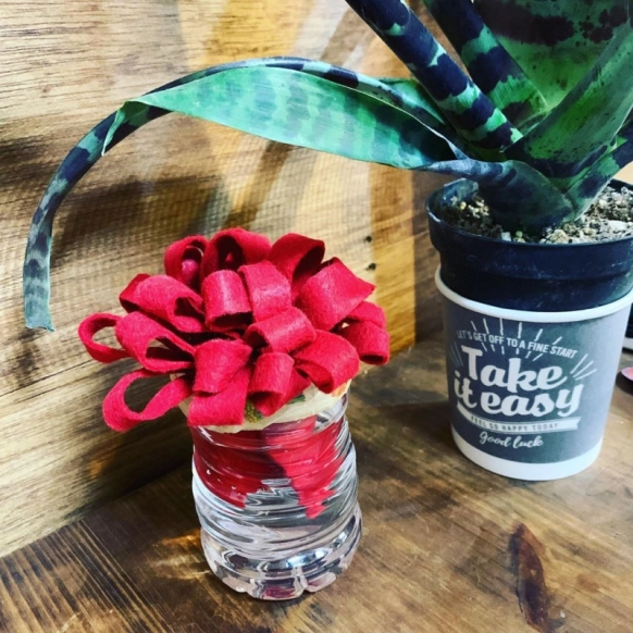 くるくると巻けばとってもかわいいお花のようになります!ボリュームが少ない場合は2枚重ねるとよりかわいく仕上がりますよ。フェルトの方がコーヒーフィルターより吸水が遅く、紙よりもしっかりしているので、長持ちするかもしれません。水の容器がペットボトルでは不安定で気になる人は、お気に入りのガラスコップなどを使うともっと素敵ですね。場所をとらずにどこにでも置けるので、フィルターの予備をたくさん作っておくといいかも。