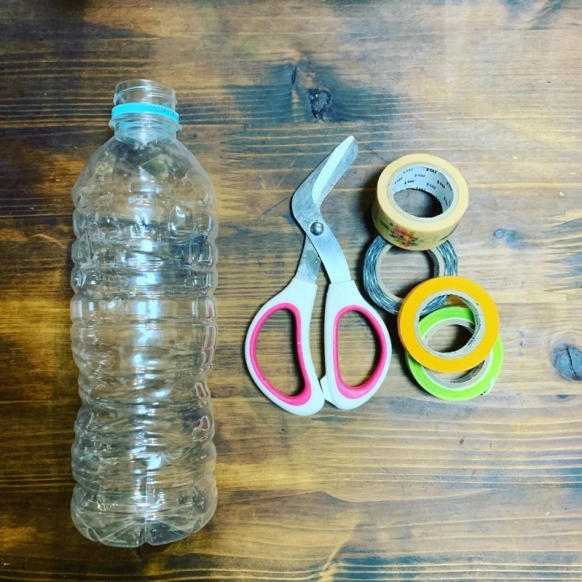 ペットボトル、はさみ、マスキングテープが基本の道具です。