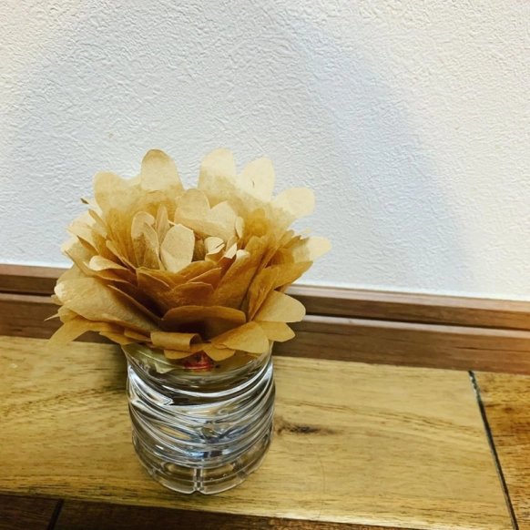 切ったものを開いて巻いたものを何枚も重ねればできあがり。8枚ほど重ねればボリュームのあるお花が完成します☆最後にペットボトルに適量の水を注いで、コーヒーフィルターを入れるだけです。