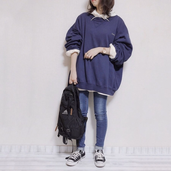 ビックシルエットのダボダボパーカーは韓国でも人気のアイテムです。シャツやニットをインして重ね着するのもかわいいですよね♡こちらもボトムはタイトにしてバランスをとると◎レディースパーカーではなく敢えてメンズアイテムをチョイスしてもOKです!