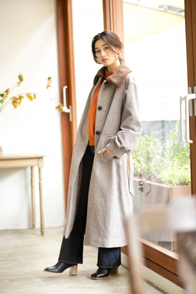 ボアの襟付きのチェックのロングコートは、袖口にプリーツが入っているのがポイント♡ フェミニンもハンサムにもスタイリングが楽しめます。合わせたのは、顔映りのいいオレンジのニット。冬場に映える赤茶系のメイクとも相性が良いのでこの時期オレンジのニットトップスが一枚あると重宝しそう! ボトムは 『MVS FLARE』のジーンズ。コンパクトな腰回り、高めに設定されたヒザから裾にかけてのフレアなラインで、脚を長くスラリと見せてくれる『MOUSSY』の定番ジーンズです。ショートブーツはウッドのヒールが抜け感を演出。ボリュームのあるボトムスにかっちりとしたショートブーツを合わせるスタイルも、今季のトレンド。ちなみにこのブーツ、後ろにジッパーがついていて脱ぎ履きしやすいのもママには嬉しいポイントです♡