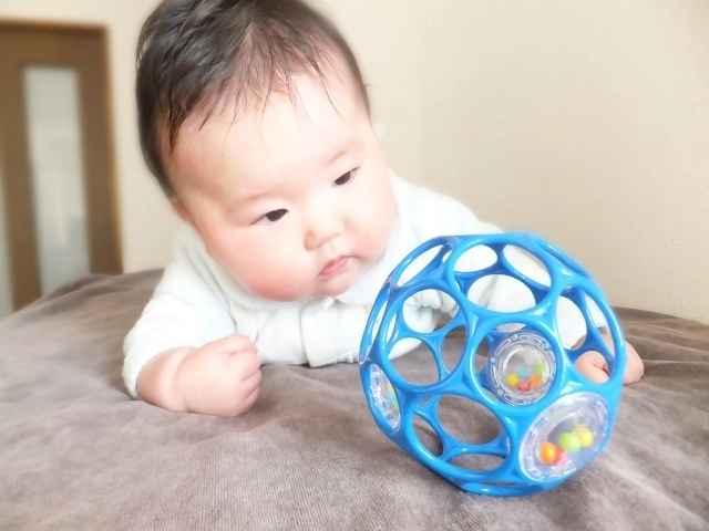生後8カ月くらいになると、指先が器用になり、身の回りの気になるものを掴んで確かめるということが増えてくるかもしれません。そんなときには掴みやすい格子状のボールを渡してみては。ビーズの入ったパーツがついているボールもあり、ラトルとしても遊べそうですね。もちろん、舐めても大丈夫なボールを選びましょう。