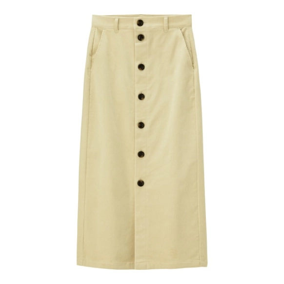 「コーデュロイフロントボタンナロースカート」はフロントボタンでトレンド感のある秋冬アイテム。すっきりとしたIラインのスカートなので、ニットなどのボリュームのあるトップスと合わせてもすっきりと着こなすことができますよ。