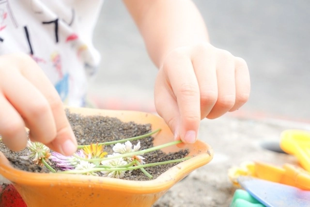 3歳児になると、外で嫌がらずに泥んこ遊びに取り組める子どもも。砂場で山を作ったりトンネルを掘ったり、草花でおままごとをしたりと、砂場遊びは想像力が鍛えられる外遊びとしておすすめですよ。