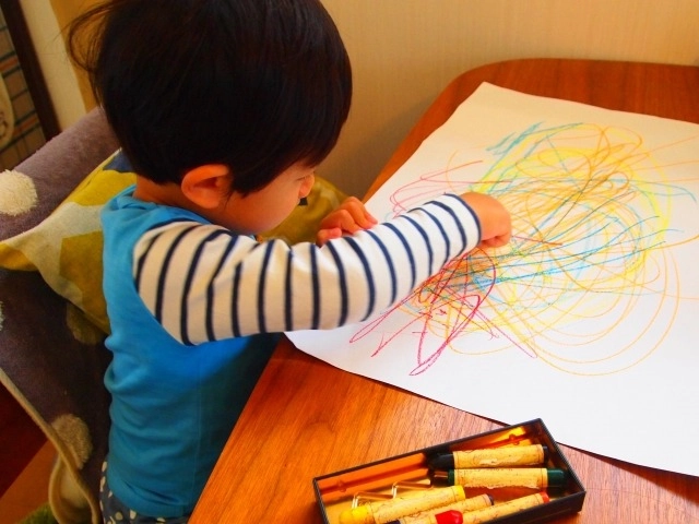 大きな画用紙にクレヨンや色鉛筆で自由に絵をかいたり、絵の具を自分の手のひらに塗ってスタンプをしたりと、お絵かき遊びでもいろいろな遊び方ができますよ。