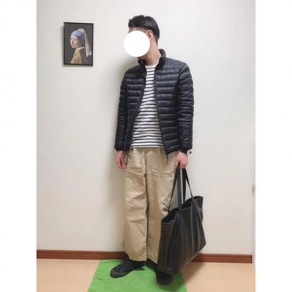 @ak_m1120さんは、メンズLサイズのジャケットをチョイス。パーカーとダウンで大きめシルエットを作った上半身に、細身パンツでクールにまとめています。
