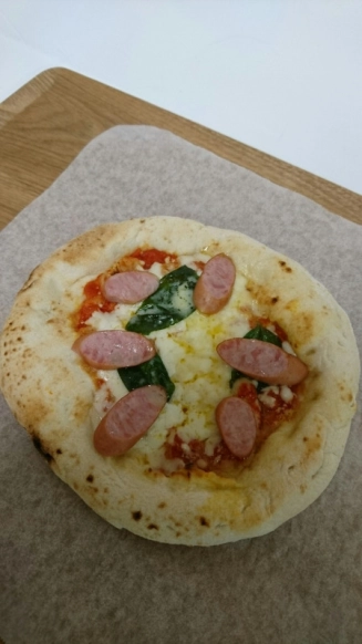 「もちもち生地が旨いマルゲリータ」は、ネーミング通りもちもち食感がくせになりそうです。マルゲリータにあらびきウインナーをカットして焼いても食べごたえができておいしくなりますよ。こちらはもっちりな食感に仕上げてお食事ピザにしています。