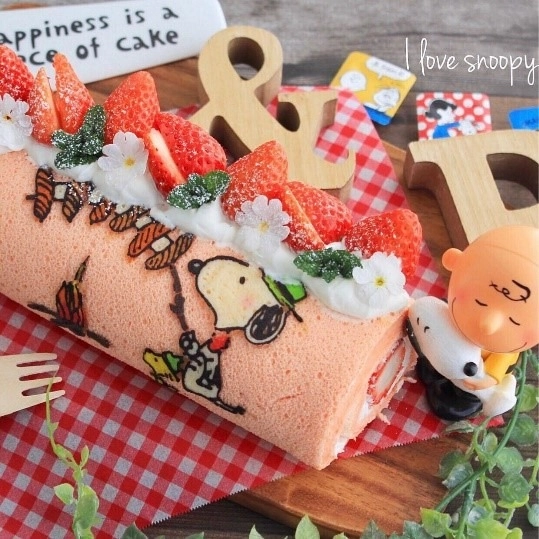 こちらは@no1214noさんが作られたひな祭りケーキです。生クリームたっぷりのケーキも良いですが、意外にデコりやすいのはロールケーキなんだそう。ピンクのロールケーキにチョコペンでかわいくスヌーピーを再現♡市販のロールケーキを買ってきて、デコレーションだけ自分でやる、なんてのも◎