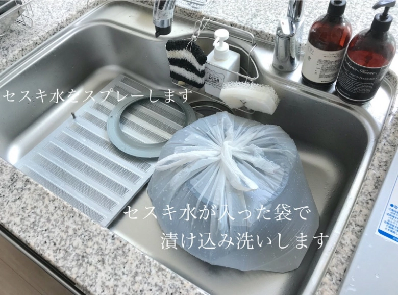 基本の掃除方法の1、2までは同様に行います。シンクではなくビニール袋を2重にしたものでつけ置きしても◎1.お湯に部品をつけたら、アルカリ性洗剤を投入。2.1時間ほど放置したらスポンジで汚れを擦ります。