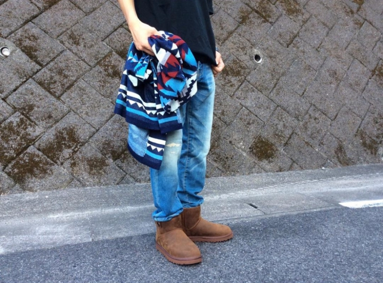 ムートンブーツはメンズのコーデにもカジュアル感をプラスしてくれます。@jeansfactory_numataさんのようにシンプルに無地のTシャツ&デニムに目を引くネイティブ柄アイテムを組み合わせ、さらっとはくのがおすすめ。